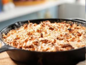 Instructions *** 11-25-21 tasty, cheesy, good *** RECIPE COURTESY OF THE KITCHEN French Onion Soup Potato Gratin 28 Reviews Level: Intermediate Total: 2 hr 25 min Active: 45 min Yield: 8 to 10 servings Share This Recipe Ingredients Deselect All Caramelized Onions: 8 tablespoons unsalted butter, wrapper reserved 5 large Spanish onions, sliced about 1/4 inch thick Kosher salt and freshly ground black pepper About 3/4 cup beef stock 2 tablespoons sherry 2 teaspoons Dijon mustard Potato Gratin: 3 pounds Yukon gold potatoes Kosher salt and freshly ground black pepper 1 pound Gruyere, shredded 8 ounces mozzarella, shredded 1 1/4 cups heavy cream 1 1/4 cups beef stock One 4 1/2-ounce bag premade croutons, lightly crushed One 3 1/2-ounce bag French fried onions Directions Special equipment: a mandoline, optional For the caramelized onions: In a large saucepan over medium-high heat, melt the butter. Once melted and bubbling, add a large handful of the onions and cook until translucent, 1 to 2 minutes. Repeat until all the onions have been added. Season with a pinch of salt and black pepper. Reduce the heat to low and cook, stirring occasionally, until the onions turn medium brown, about 30 minutes. If the onions start to get too dark, add 1 to 2 tablespoons of beef stock as necessary. Add the sherry to deglaze the pan. Add the mustard and stir to coat. Season with salt and pepper. Remove from the heat and set aside. For the potato gratin: Preheat the oven to 400 degrees F. Using a mandoline or a sharp knife, cut the potatoes into thin slices. Do your best to keep the potatoes in a stack--this will make it easier to layer them in the pan. Set the potatoes aside. Use the reserved butter wrapper to lightly grease the bottom and sides of a large (12-inch) cast-iron skillet. Discard the wrapper. Arrange a thin shingled layer of potatoes in concentric circles around the skillet. Season the potatoes with salt and pepper, then arrange an even layer of caramelized onions on top of the potatoes. Season with salt and pepper. In a medium bowl, combine the Gruyere and mozzarella and reserve half for later use. Sprinkle on a layer of the remaining cheese mixture over the onions. Repeat the layers until all the ingredients (not including the reserved cheese) have been used. Press down firmly on the layers to flatten. In a large bowl or measuring cup, combine the heavy cream and beef stock and pour over the gratin. Cover the skillet with foil and place on a sheet pan. Bake the potatoes, covered, until the top and edges have begun to brown and the potatoes are tender, 1 hour 15 to 1 hour 30 minutes. You can test by inserting a knife into the potatoes; if it goes in and comes out without resistance, then the potatoes are done. Remove the skillet from the oven, remove the foil and turn the broiler on high. Combine the croutons and French fried onions. Cover the gratin with a layer of the crouton mixture followed by the remaining cheese. Broil until golden brown and bubbly, 5 to 8 minutes. Serve and enjoy! My Private Notes Add a Note Show: The Kitchen Episode: Fabulous Friendsgiving This recipe published with BigOven, and can be imported instantly by BigOven users. Download your free trial at www.bigoven.com. ![]() |